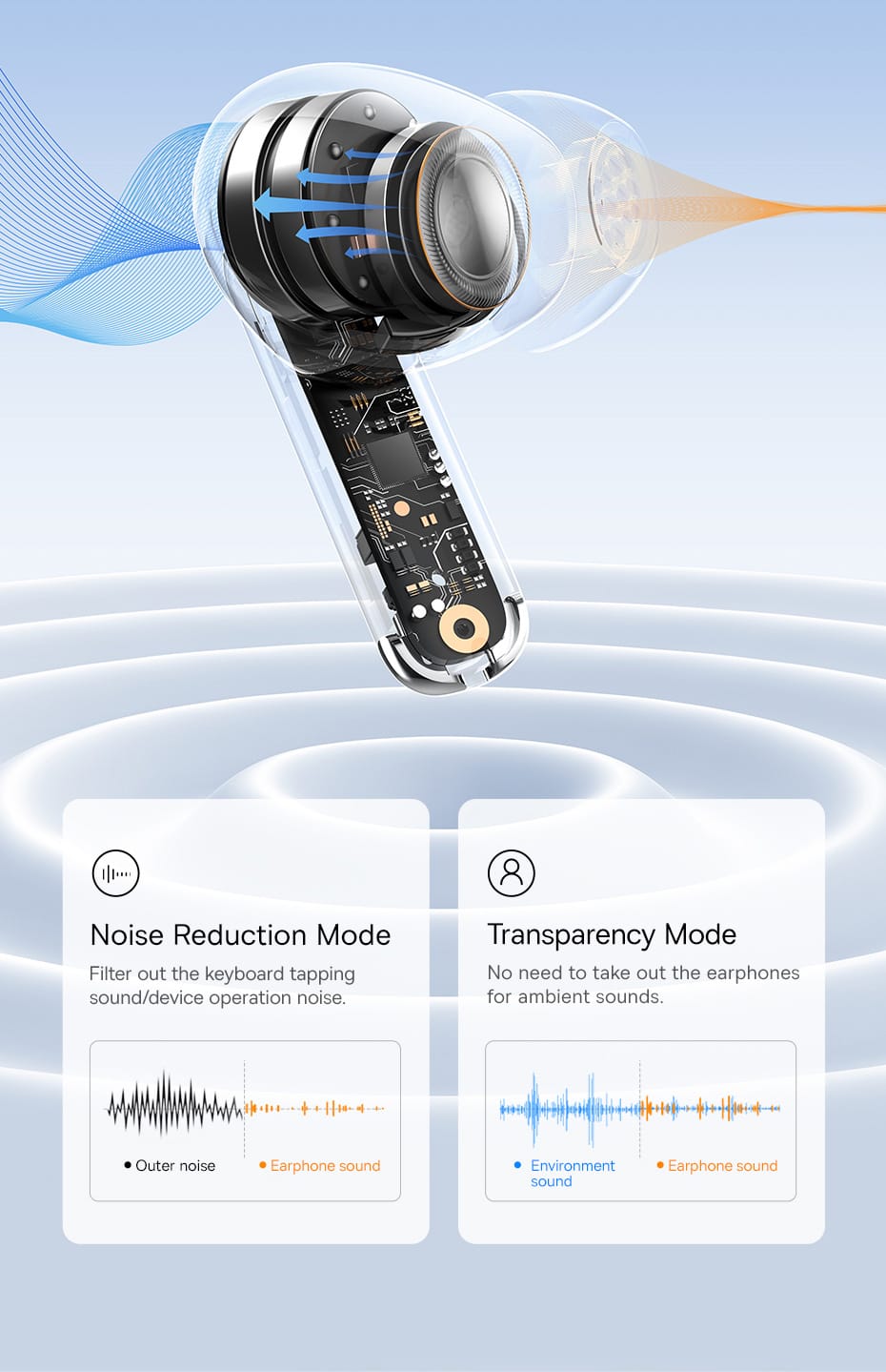 - 2 modes of operation: Baseus headphones have 2 modes of operation so that you can adjust them to your needs. The first – noise cancellation mode – will let you lose yourself in your favorite songs, as it easily reduces outside noises. However, want to hear what's going on around you? Choose Transparency mode, so you'll no longer miss an important announcement at the airport or train station.