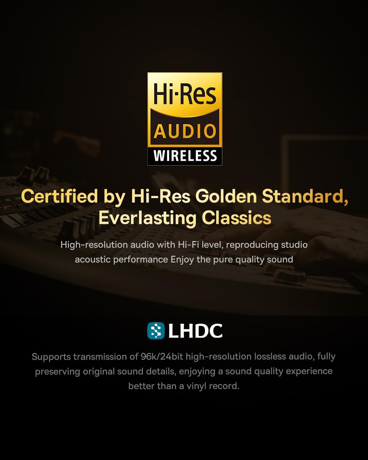 •  Hi-Res Certified + LHDC 5.0 – Experience true studio-level sound with 96kHz/24bit high-res audio streaming. Better than vinyl. Literally.