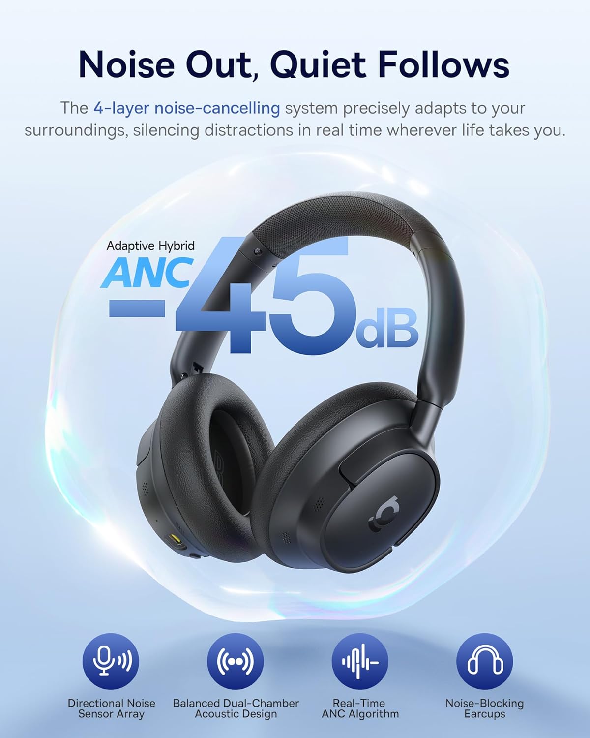 • Real-Time Adaptive Hybrid ANC: Experience deep, intelligent quiet wherever life takes you. Bass BH1 NC noise cancelling headphones use advanced 4-layer adaptive ANC with real-time noise detection to reduce up to -45dB of background noise—perfect for travel, work, or daily life.