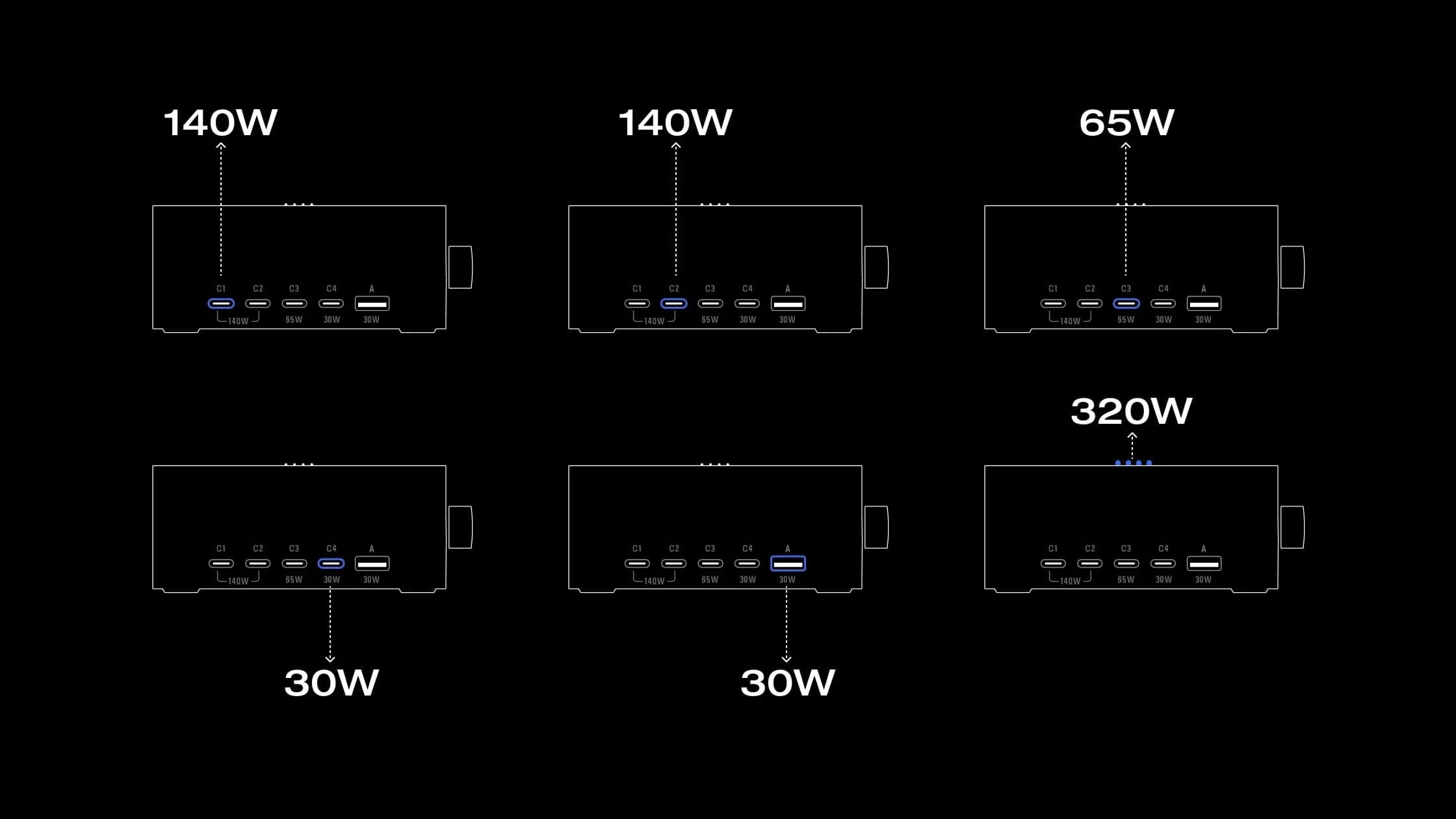 - Total number of output ports 4 × USB-C, 1 × USB-A, Pogo Pin 320W