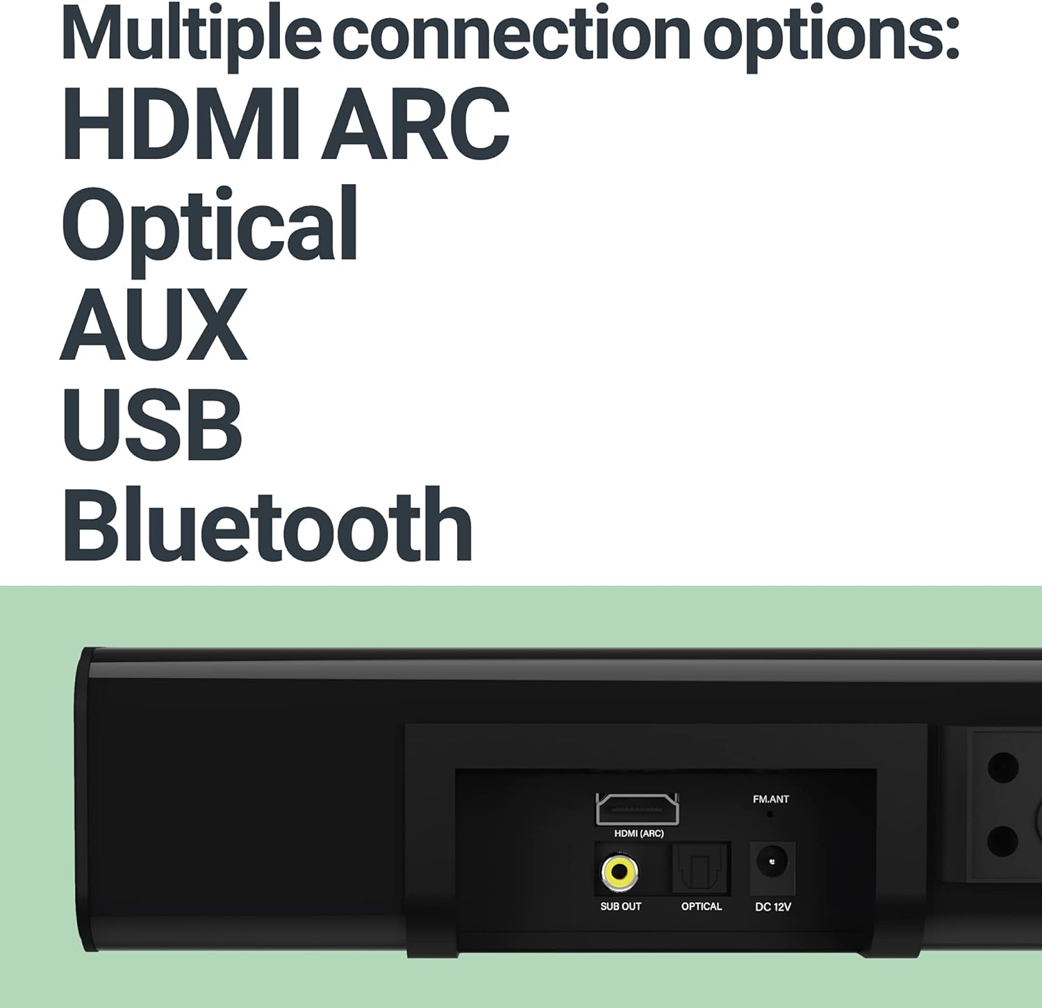 • 𝗣𝗔𝗖𝗞𝗘𝗗 𝗙𝗨𝗟𝗟 𝗢𝗙 𝗙𝗘𝗔𝗧𝗨𝗥𝗘𝗦: Our soundbar and subwoofer has been designed with ease of use in mind – simply plug in, and play using the wide range of connections. Connect to your TV in lightning speed by using the HDMI ARC or optical input for high clarity and rich audio. Listen to your playlists straight from your phone through the latest Bluetooth technology, plug in your MP3 player to the AUX or USB input.