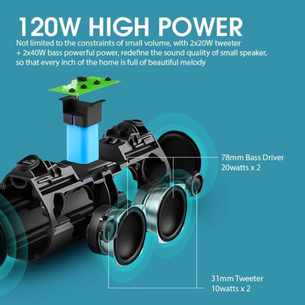 - Total Output = Bass Driver 80 Watts + Tweeter 40 Watts = 120 Watts Max Output