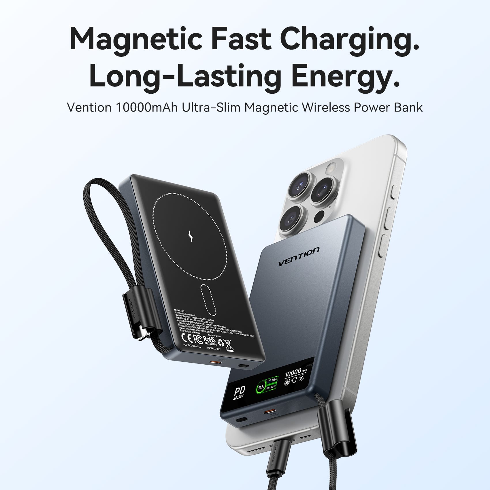 The Vention 10000mAh Magnetic Wireless Power Bank is the high-capacity evolution of the ultra-slim portable charger line, perfect for resellers looking to offer a balance of endurance and design. This model doubles the power reserves to 10,000mAh, providing multiple recharges for modern smartphones while maintaining a sleek, ergonomic profile. Featuring powerful N52 magnetic suction, it snaps firmly onto MagSafe-compatible devices for an efficient 15W wireless experience. With a robust 22.5W wired output, it caters to users who demand fast, flexible charging options for their phones, tablets, and accessories in a professional grey finish.