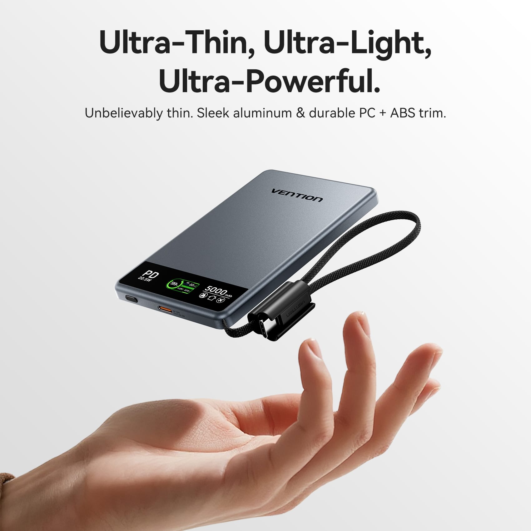 The Vention 5000mAh Magnetic Wireless Power Bank is a masterclass in minimalist design and high-speed utility, specifically tailored for the mobile professional. This ultra-slim charger features strong N52 magnets that align perfectly with MagSafe-compatible devices, providing a secure, snap-and-charge experience without the bulk. Despite its pocket-sized profile, it packs a punch with 22.5W wired output and 15W wireless charging, offering a versatile solution for users who need a quick boost on the go. Its premium metallic grey finish and lightweight build make it an attractive upsell for customers seeking a balance between elegance and performance.