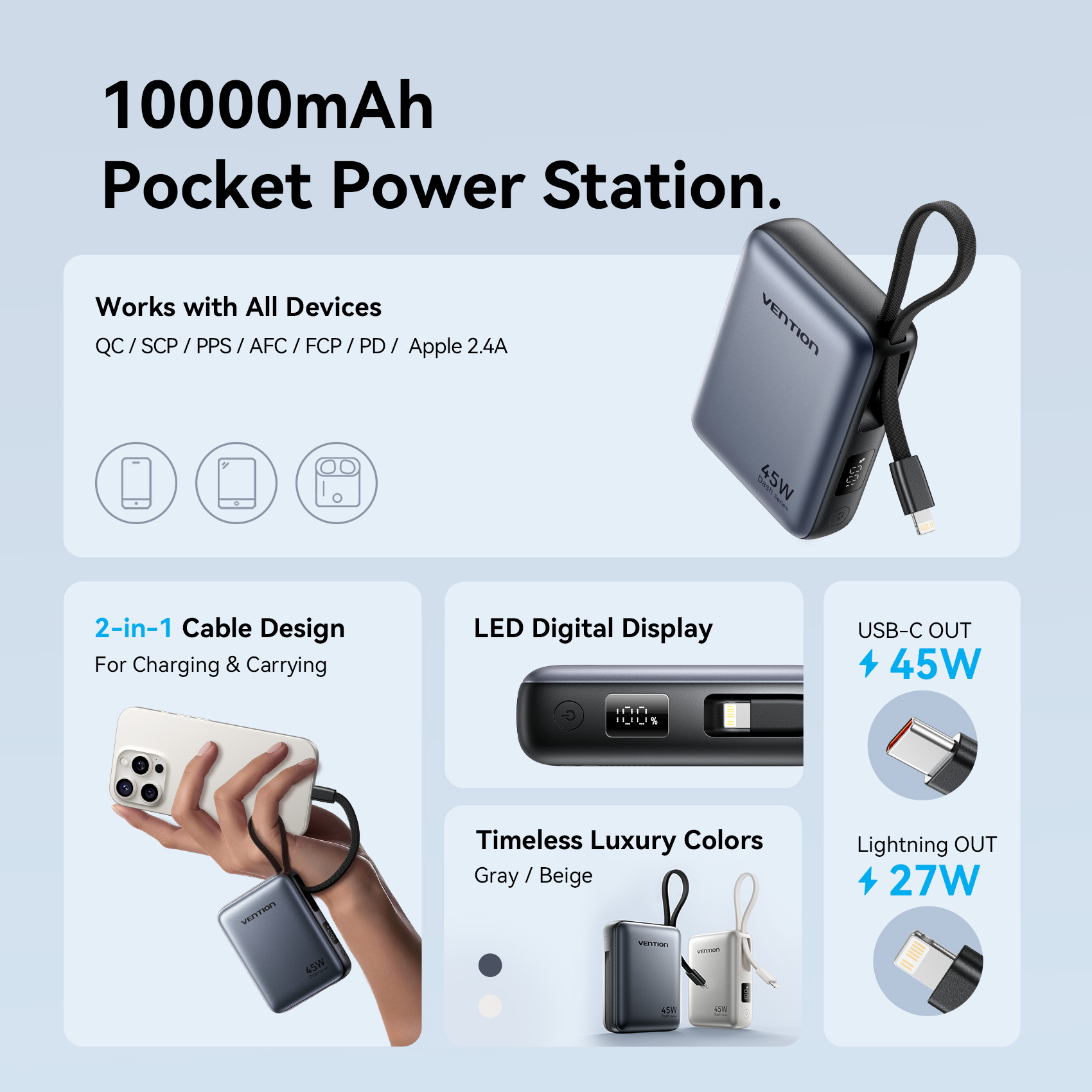 Vention Powerbank 10000mAh 45W Built-in USB-C & Lightning Cables FKMH0 Grey