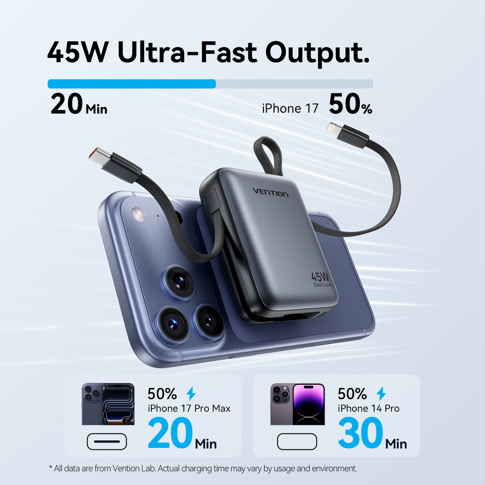 • 45W PD Fast Charging: Unlike standard 22.5W power banks, the 45W output is powerful enough to provide a "fast charge" for an iPhone 15/16/17 series, Samsung S-series, and even a MacBook Air or iPad Pro.