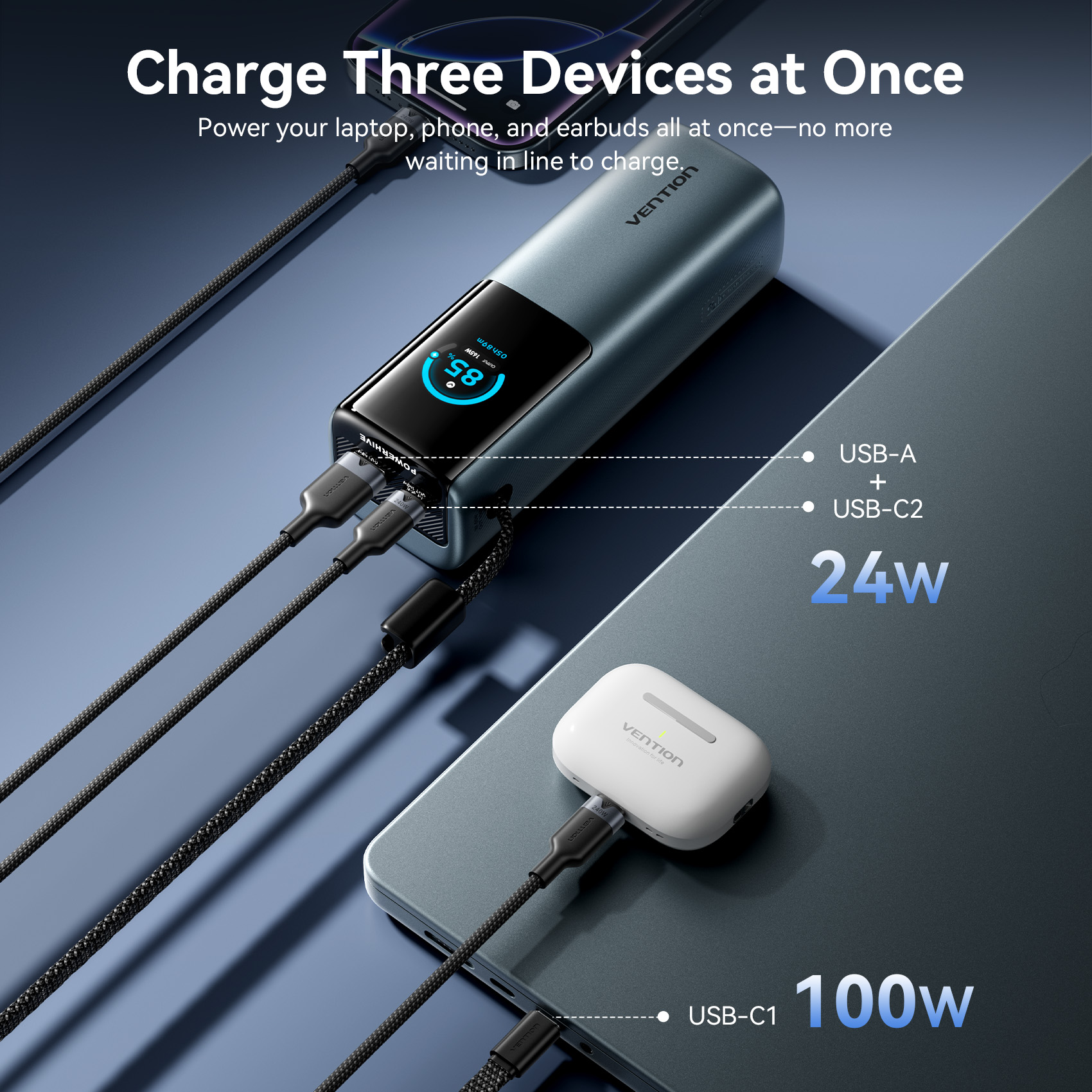 The Vention FKFH0 is the powerhouse flagship of the Vention power bank lineup. Part of the "Powerhive" series, it is designed for heavy users who need to charge laptops and multiple high-drain mobile devices at full speed simultaneously.